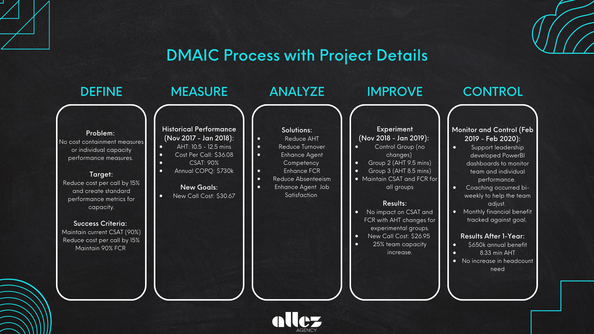 The support team was highly resistant to change as it had operated under its current framework for over a decade. We also did not know the best solution to solve our problem. To accomplish the mindset shift and narrow down our options we chose Lean Six Sigma to help us Define, Measure, Analyze, Improve, and Control.